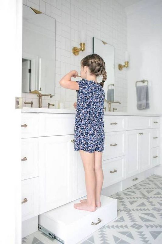 Vicino al lavandino si può creare una mensolina per spazzolino e dentifricio personalizzata con nome o colore preferito e di facile utilizzo … basta un foro per lo spazzolino e un ripiano comodo per il dentifricio. Per raggiungere il lavandino uno sgabello leggero e colorato con una superficie antiscivolo che renderà quindi l’azione più sicura.