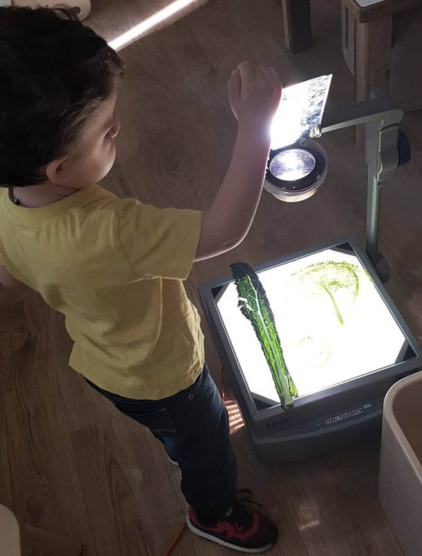 Ma l’attività che più di tutte ha catturato l’attenzione del mio bambino è stata la lavagna luminosa: chissà perché, questo strumento l’ha davvero entusiasmato! Lui correva al tavolo, prendeva una foglia di verza oppure una fetta d’arancia e, insieme all’atelierista, ammirava l’ombra proiettata sul muro guardando le varie venature, i fori, la forma della foglia diventata molto più grande … sarebbe rimasto lì ore e ore, tanto che per convincerlo che oramai il laboratorio era finito, abbiamo dovuto fingere che il proiettore – oramai stanco – aveva deciso di riposarsi un po’.
