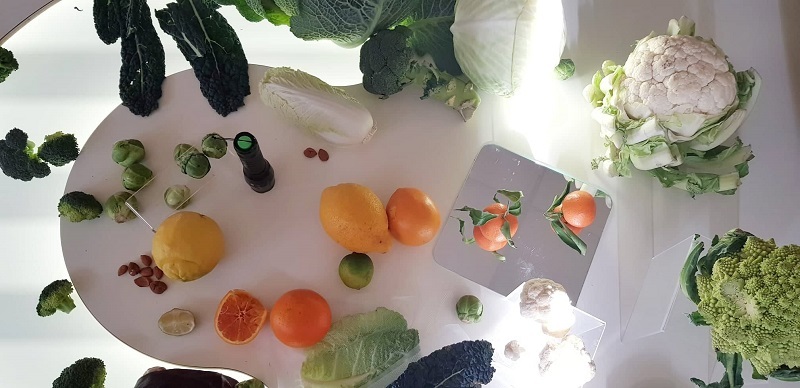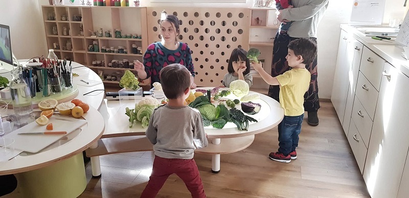 Non sapevo bene cosa aspettarmi da questa esperienza, ma la cosa mi incuriosiva parecchio. Anche se, devo ammetterlo, avevo un po’ il timore che il mio bambino, di due anni e mezzo, fosse troppo piccolo per partecipare ad un laboratorio di questo tipo: avrebbe compreso tutto? Si sarebbe annoiato subito? Devo dire che mi sono dovuta ricredere dopo pochi minuti – secondi in realtà – perché non appena entrato nell’aula, dove ad attenderci c’era l’atelierista, si è completamente dimenticato della mia presenza ed è corso al tavolo dove erano appoggiate verdure e frutta: cavoli, broccoli, cavolfiori, verze, arance, cedri … un esplosione di colori e profumi!