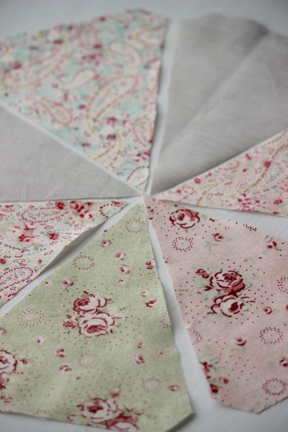Disegnare su di un cartoncino un triangolo isoscele come campione,il mio l’ho creato con una base di 14cm e i lati di 16 cm,con l’aiuto del campione e una matita,segneremo il tessuto scelto per agevolare un taglio preciso.Filo ,spago,nastro e colla per dare vita alla nostra ghirlanda di bandierine.