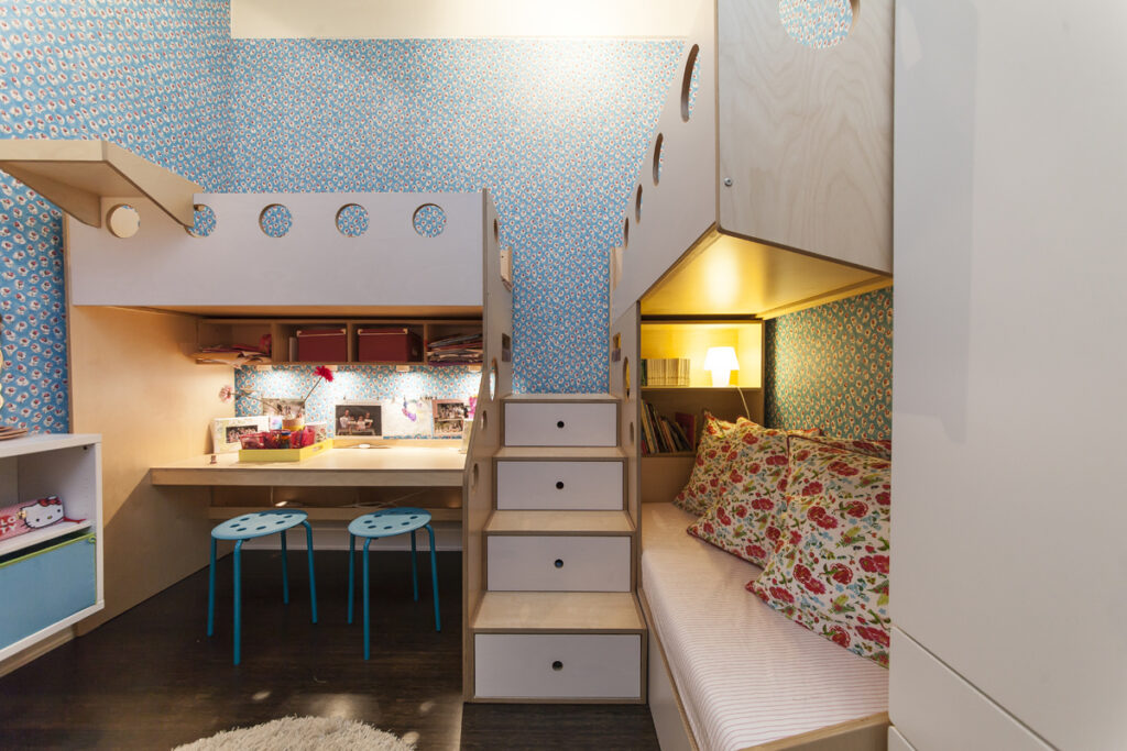 È un po’ la stessa logica dei grattacieli che proiettano gli spazi in altezza quando la larghezza è impraticabile. Letti a castello e letti a soppalco sono le due soluzioni che traggono il massimo vantaggio dalla verticalità.
