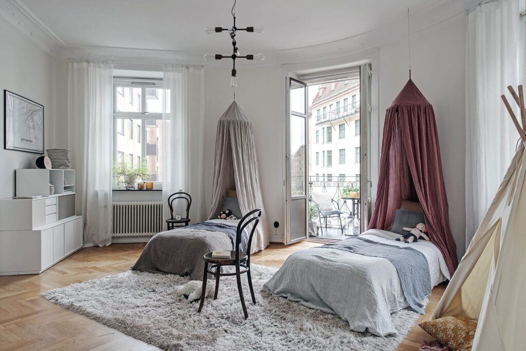 Non vuoi un impatto troppo aggressivo sulle superfici o nelle zone perimetrali della stanza? Le tende possono assicurarti comunque un buon livello di intimità senza doverti impegnare in troppe lavorazioni e interventi murari. In questa circostanza è sufficiente solo una guida o un binario sul soffitto e il gioco è fatto, oppure puoi giocarti la carta del baldacchino per creare un’atmosfera più intima attorno a ciascun letto.