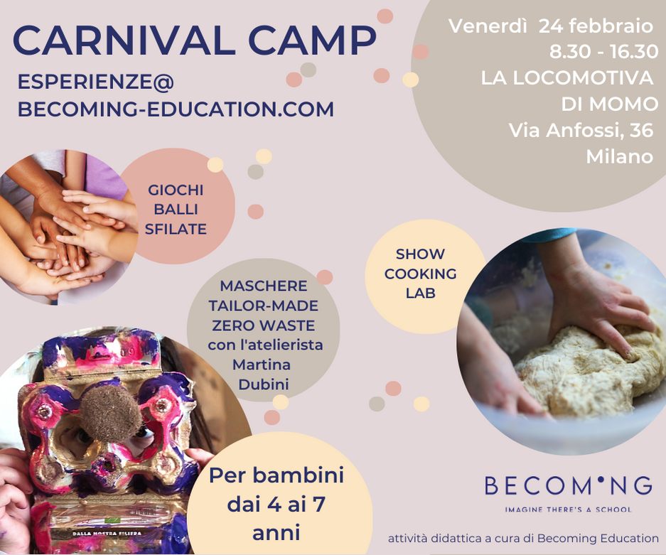 Durante il campus i bambini potranno vivere diverse esperienze: giochi, balli, show cooking di Carnevale per la preparazione di una gustoso e colorato pranzo. Con la partecipazione strordinaria dell’atelierista Martina Dubini che condurrà i bambini in un divertente atelier volto alla realizzazione costumi zero waste. Non mancherà certamente la sfilata finale!