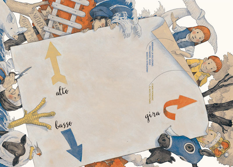 Trama: Sembra facile leggere il libro, ma non lo è! Soprattutto quando si scopre che i personaggi disegnati sulla pagina non stanno fermi lì dove li ha lasciati la matita, ma possono fluttuare nello spazio bianco del foglio e assumere comiche posizioni, a seconda di come il lettore tiene il libro fra le mani. E così i due sventurati Hansel e Gretel si trovano a testa in giù, la vecchia Baba Jaga ha la sua capanna rovesciata. Il peggio arriva poi quando il mare in cui naviga Achab, dietro a Moby Dick, comincia a colare sulla testa dei bambini e della strega. A poco servono gli accorati consigli al lettore: anche il povero imperatore ormai nudo per la nota burla finisce con le gambe all’aria…