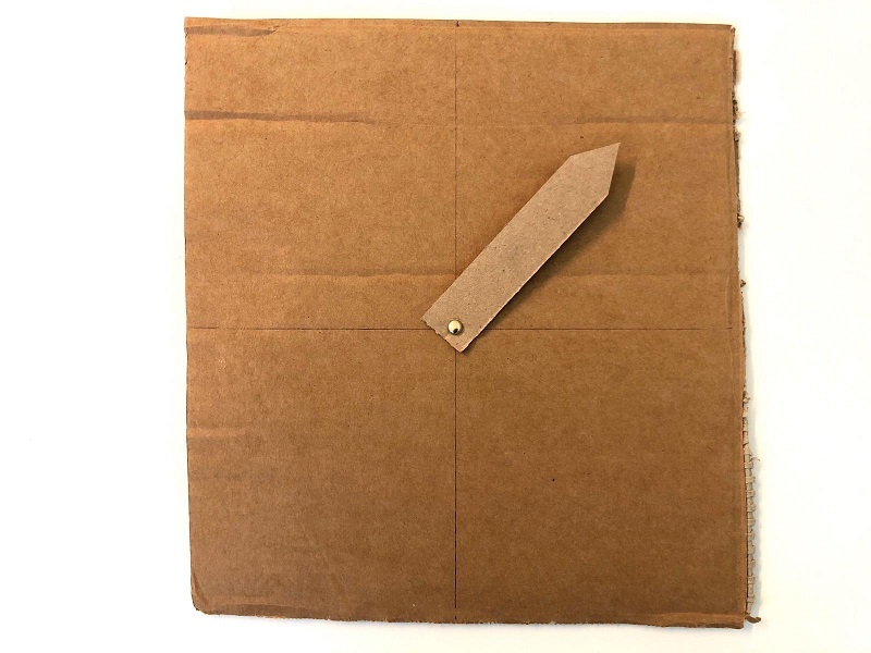 Col resto della scatola, disegnate la sagoma di una freccia lunga circa 15 cm e ritagliatela. Fate un foro sull’estremità opposta alla punta della freccia ed inserite il fermacampione.