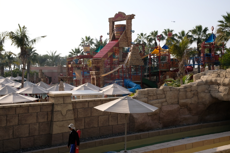 I teli si possono affittare sul posto in diversi punti del parco, consiglio di portare il minimo indispensabile e di indossare già il costume così da evitare anche le code per gli spogliatoi. In meno di 10 minuti i ragazzi erano già a far la coda per i vari scivoli (conviene comprare lì il VIP pass per saltarle) che si possono fare solo se l’altezza dei bambini supera i 120 cm. Lo scivolo più emozionante è sicuramente quello verticale ma sono rimasti affascinati dallo scivolo che ti conduce in un tunnel trasparente circondato da mante e squali. Li abbiamo lasciati liberi di girare da soli le varie attrazioni, ci sono bagnini e vigilanza ogni 10 metri e la sicurezza a Dubai è totale ovunque. Noi con la bambina ci siamo sistemati nella zona kids dove ci sono diversi giochi d’acqua e piscine. Siamo rimasti subito affascinati da uno degli aspetti più belli di Dubai: la totale integrazione tra famiglie provenienti da paesi, culture e religioni diverse. Mi ha commosso vedere mamme col burkini accanto a mamme occidentali in bikini o orientali con costumi interi più castigati, tutte con un unico obiettivo comune: far divertire i loro bambini e bambine che, senza conoscersi, giocavano tra di loro. Ci siamo poi spostati in spiaggia dove ci sono lettini a disposizione e un bel prato ombroso che degrada sulla spiaggia che è stato perfetto per un collettivo riposino di gruppo dopo la notte quasi in bianco (l’adrenalina degli scivoli e il bagno in mare con acqua non proprio calda aiuta comunque a stare svegli!).