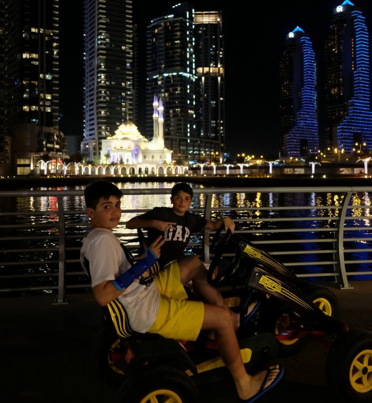 Verso le 17 siamo tornati al nostro resort per rilassarci in piscina (molto più tranquilla rispetto all’Atlantis!) e poi cambio per la serata. Meta prescelta ed amore a prima vista: Dubai Marina. Qui avevamo prenotato una settimana prima un tavolo al Pier 7, in particolare sulla terrazza del ristorante libanese Abd el Wahab al quinto piano, non troppo formale e con un menù adattabile a bambini curiosi di provare cibi nuovi. Il miglior hummus mai mangiato con una vista mozzafiato sulla marina e i suoi grattacieli e yacht da sogno! È uno dei pochi posti a Dubai dove c’è una passeggiata pedonale e ciclabile, purtroppo dopo cena eravamo troppo stanchi per fare poco più di 10 minuti di camminata per cui ci siamo infilati nel Dubai Marina Mall nel cui parcheggio abbiamo preso un taxi per tornare a casa (NB: i taxi pubblici sono il miglior modo per spostarsi ed anche il più economico, autisti gentili e prudenti).