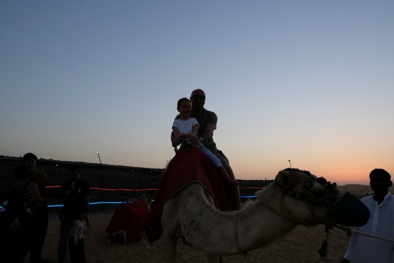 Alle 15.00 appuntamento in hotel con un’autista guida che ci ha condotto nel deserto a bordo di una Land Cruiser 4×4. Dopo un’ora di autostrada ci siamo fermati in una stazione di servizio per sgonfiare i pneumatici in modo da intraprendere il dune bashing nel deserto (corsa sulle dune, come andare sulle montagne russe!) e fermarci a fare foto a metà percorso nel punto più alto prima del tramonto. Verso le 18 siamo poi arrivati ad un accampamento dove organizzano il barbecue (carne ottima! Hanno comunque anche un menù vegetariano avendo molti ospiti indiani e orientali) ed uno spettacolo con il fuoco, un danzatore tradizionale, una danzatrice del ventre ed il giro in cammello.
