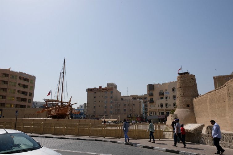 Prima tappa: Deira, il quartiere più antico di Dubai dove ci sono i suq dell’oro, delle spezie, dei profumi e il mercato del pesce. Essendo venerdì, il loro giorno di festa, le botteghe non erano tutte aperte ma forse coi bambini è stato un bene perché la zona non era super affollata e quindi la passeggiata è stata molto rilassante. Siamo rimasti affascinati dalle vetrine piene zeppe di oro e gemme, perfino una corona e un mega diamante e siamo rimasti intontiti dall’odore delle spezie, alcune delle quali a noi sconosciute. Abbiamo poi preso un abra pubblico (tradizionale imbarcazione a legno motorizzata, prezzo del biglietto 1 Dirham AED equivalente a 22 centesimi in euro) per attraversare il Dubai Creek e scendere sull’altra sponda a Bur Dubai, dove abbiamo passeggiato nel distretto storico di Al Fahidi, fino ad arrivare al Dubai Museum all’interno dell’Al Fahidi Fort, la costruzione più antica della città risalente al 1799. Essendo venerdì abbiamo ascoltato la preghiera dalle varie moschee ed assistito all’uscita da una funzione.