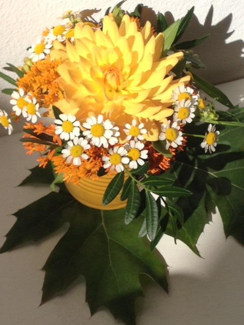 Ecco una composizione che ben interpreta queste giornate: dalia arancio tenue, fiorellini di camomilla e asclepia arancio, composte in un barattolo giallo senape .