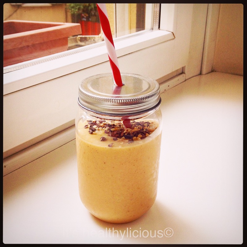 Versare tutti gli ingredienti nel boccale del vostro frullatore e frullare a potenza media per -4-5 minuti a seconda della potenza del vostro attrezzo da cucina. Non aumentate troppo la velocità per non scaldare troppo la frutta che così perderebbe molte proprietà nutritive e inoltre l’effetto “gelatoso” di questo frullato dato dalle banane congelate.