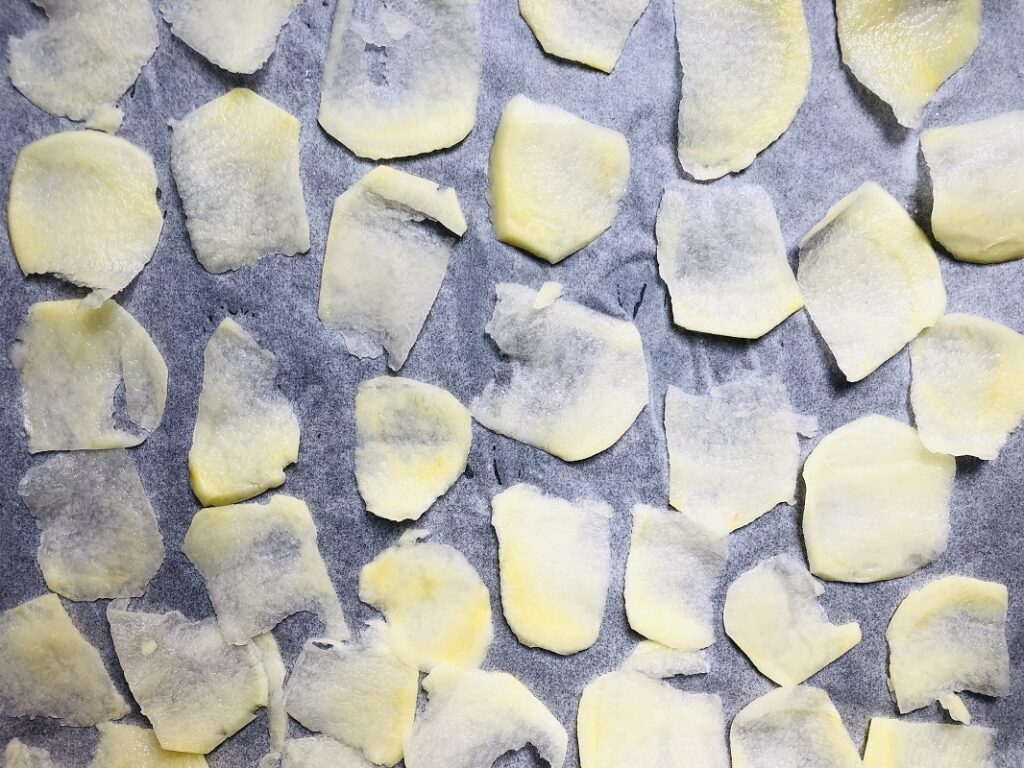 La cottura tradizionale prevede il forno in modalità statico per 5 ore a 80° ma la cottura veloce promette ugualmente ottimi risultati infornando a forno già caldo (170°) modalità ventilata per 30 minuti controllando di tanto in tanto il livello di cottura delle chips.