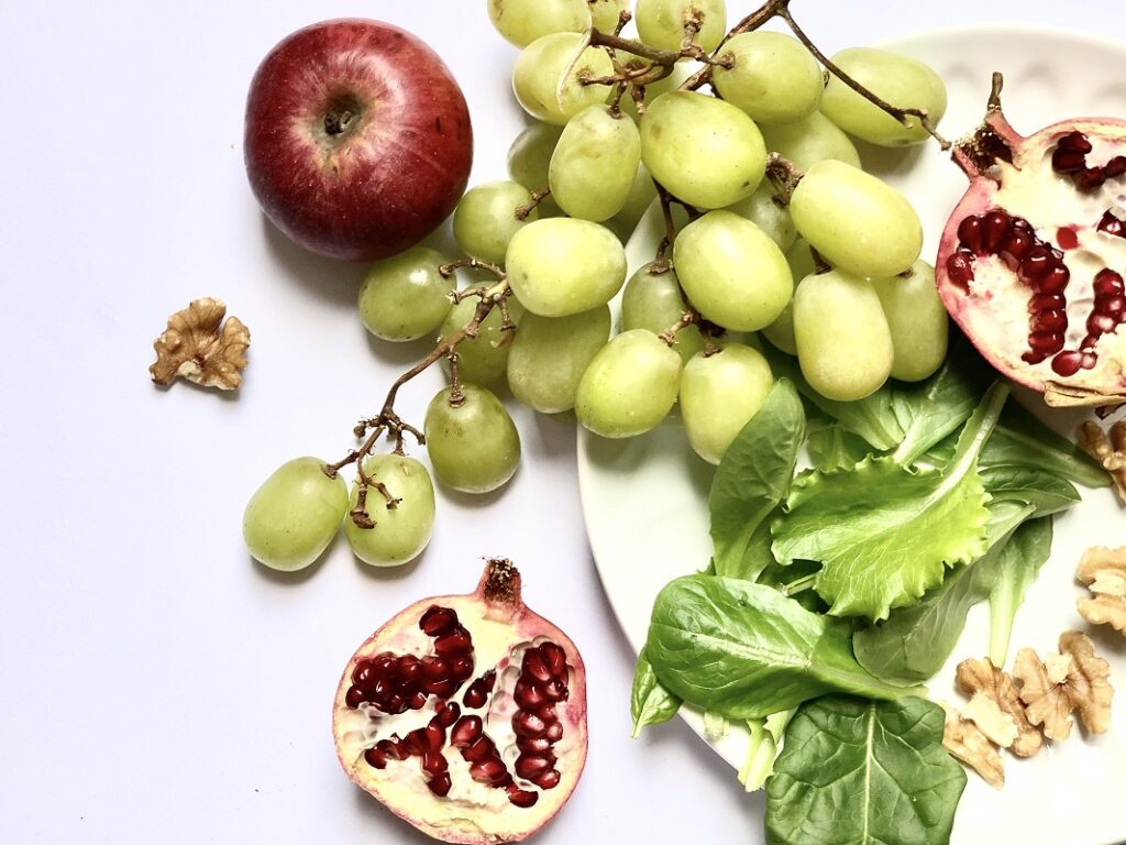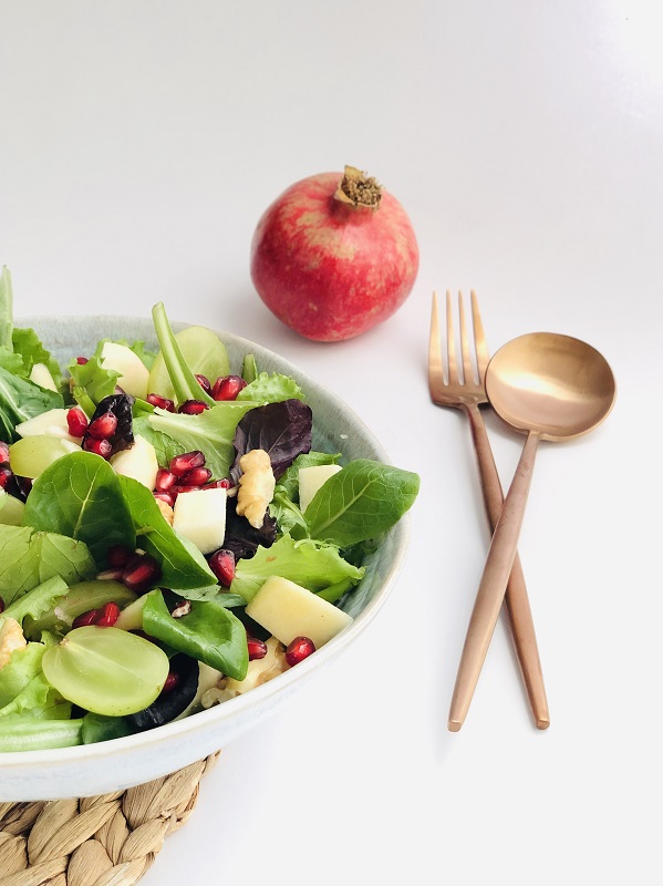 In una ciotola grande, o in ciotoline monoporzione, versare uno strato di insalata e guarnire con la mela a cubetti, l’uva tagliata, i semi di melograno e le noci.
