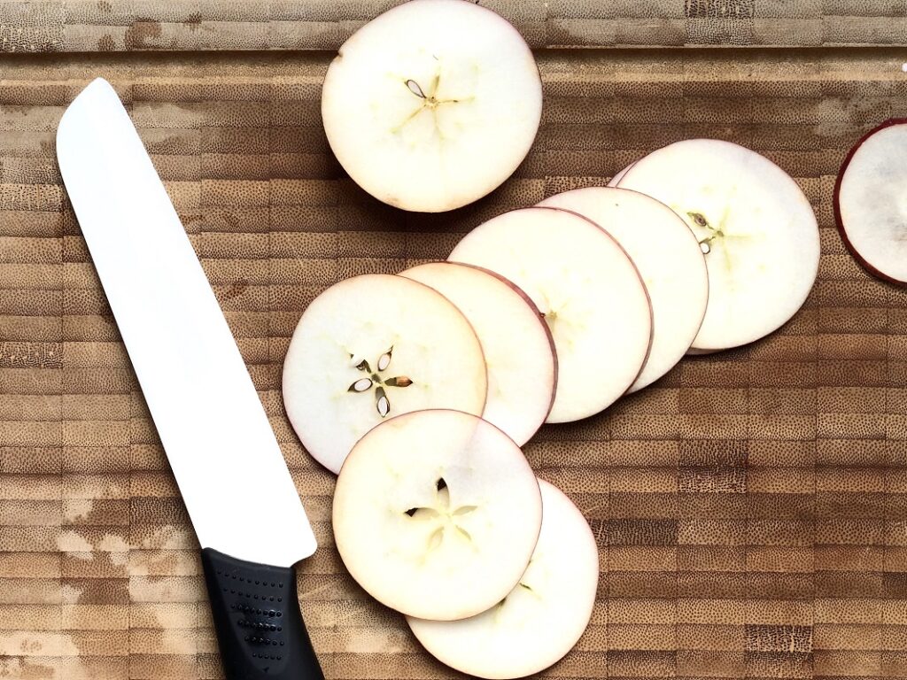 Con un coltello affilato tagliare trasversalmente (guarda immagine) la mela a fettine con spessore di massimo 3 mm