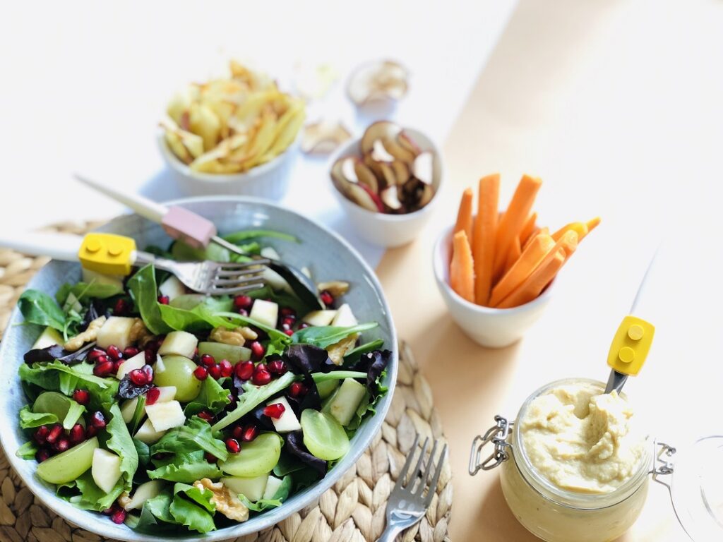 Chips di patate “Agata”, una bella insalata misticanza melograno, mela Annurca, uva Tipson e noci, Chips di mela “Annurca”, Carote di Chioggia e Hummus e una mousse di Cachi maxim. Pronte? Vi svelo tutte le mie ricette!