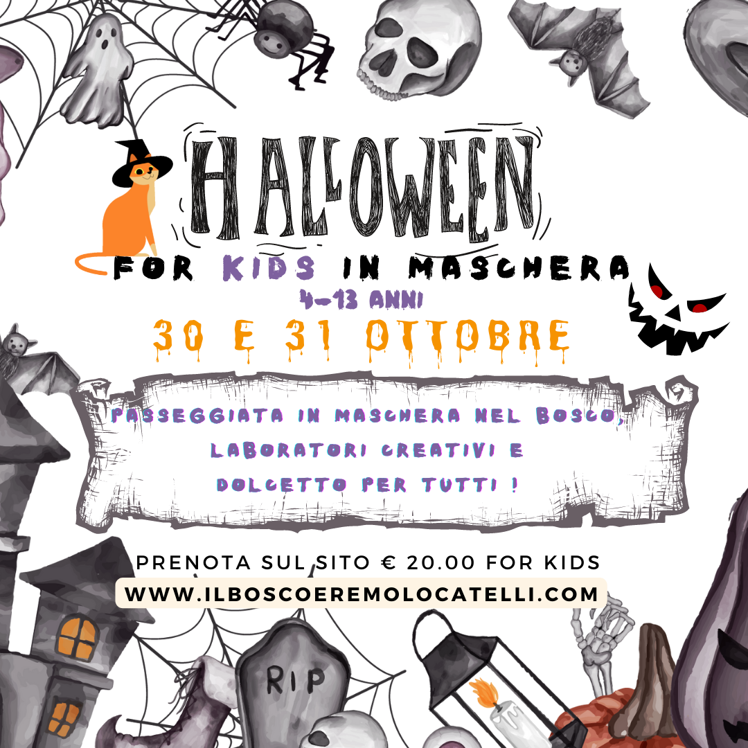Le attività per Halloween, come vuole la tradizione, toccano in primis tutto quello che il Bosco in modo naturale mette a disposizione, divertente appuntamento per bambini, con animazione a base di mostri, saranno 2 ore in cui i bambini sperimenteranno laboratori creativi e una faranno una passeggiata nel bosco circondati da scoiattoli, uccellini ma anche da diversi ostacoli da superare! Accompagnati da “mostruosi” educatori, potranno mostrare i loro magnifici travestimenti a tutti gli abitanti del bosco e, infine, dolcetto a tema per tutti!
