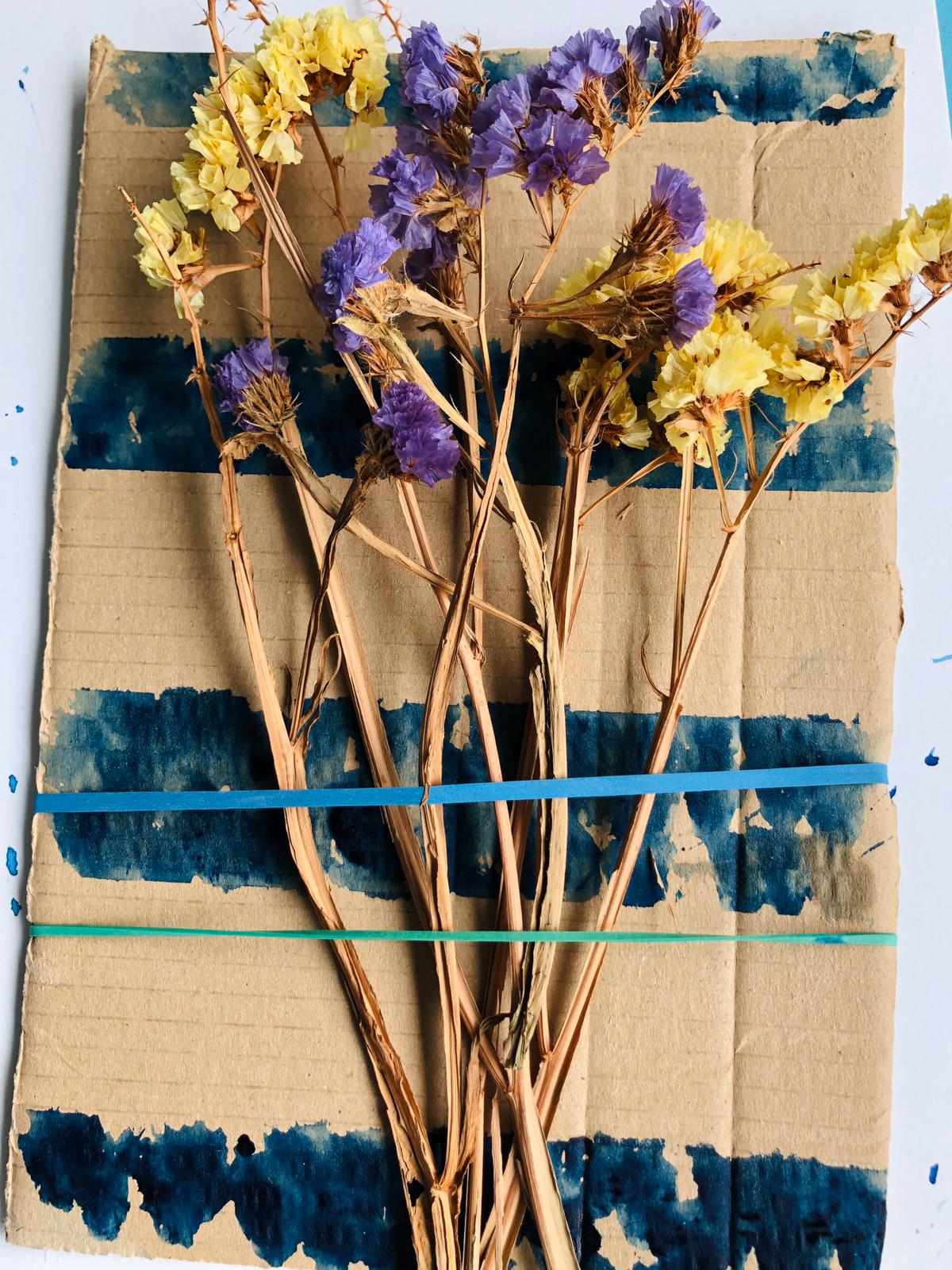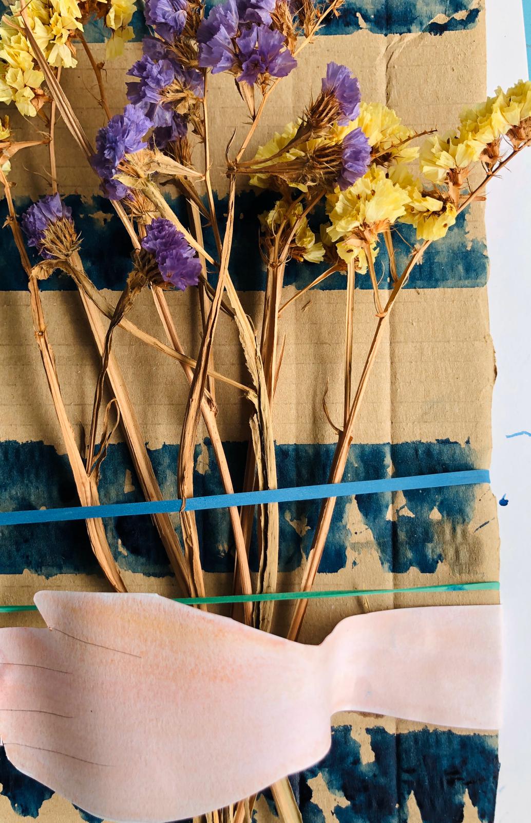 - Rimuovete lo scotch di carta dal cartone e, usando gli elastici, incastrate qualche fiore sul cartoncino, come se fossero incollati.