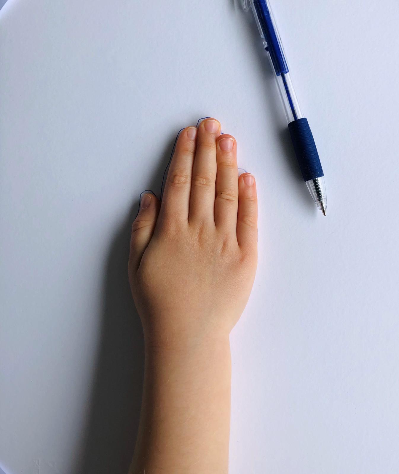 - La prima cosa da fare, una volta recuperati tutti i materiali necessari per questo laboratorio, è chiedere a vostro figlio di disegnare la sagoma della sua mano. Dovrebbe tenere le dita chiuse, e cercate di disegnare anche polso e avambraccio.