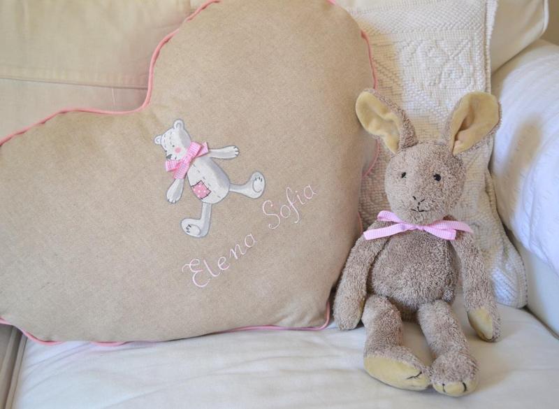 Finita la base, posso dipingere il soggetto e personalizzarlo con il nome. L’orsetto bianco ci sta benissimo e così come il nome: Elena Sofia. Una volta ultimato il dipinto, fisso il colore con il ferro da stiro. Per i cuscini è importante usare una vernice speciale per tessuti e che sia lavabile. Aggiungo il fiocco rosa su l’orsetto, imbottisco generosamente il cuscinone con materiale anallergico, pronto per l’imballaggio e a partire con il corriere. Buon viaggio!