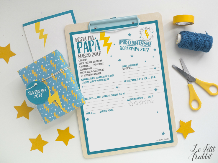 Voi cosa dovete fare? Semplicemente cliccare QUI e scaricare il Kit del Superpapà di Le Petit Rabbit, stampare, impacchettare, lasciare che i vostri bimbi si divertano a disegnare e scrivere.