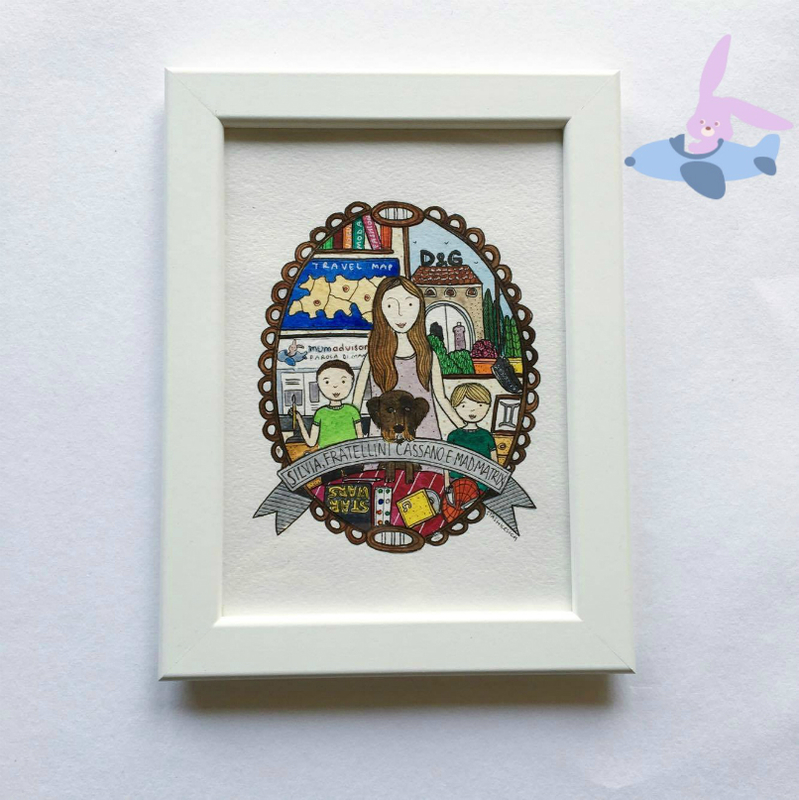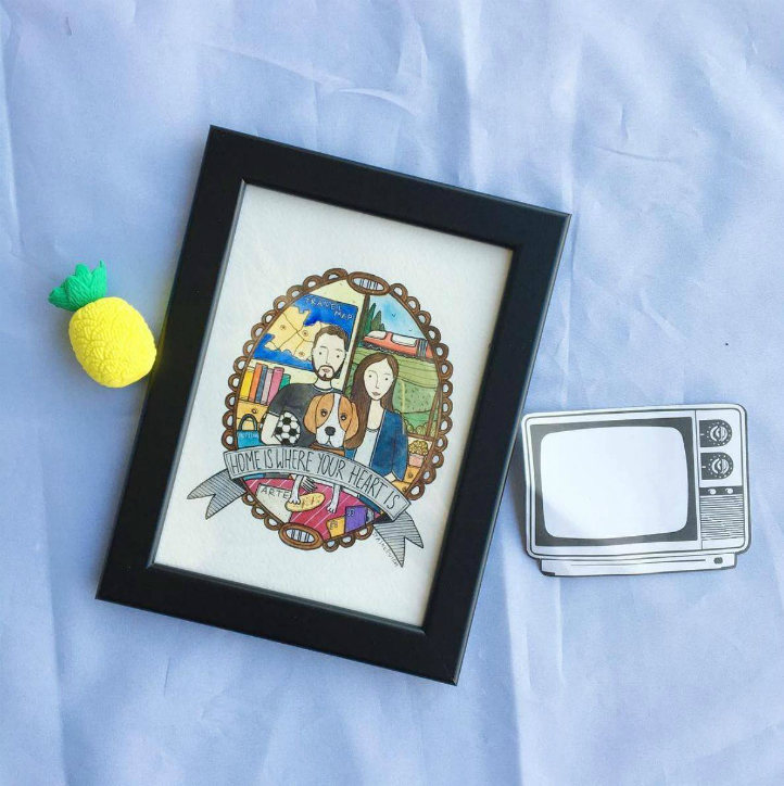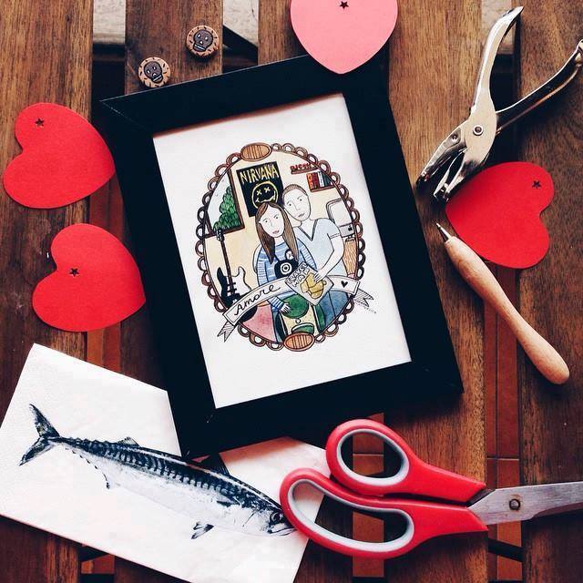 Poco prima di Natale mi sono messa a fare un pò di ricerca online ( eh si lo prendo sul serio, quasi come un lavoro ) per cercare un regalo ad effetto WOW per mio marito. Cercavo qualcosa di veramente originale, un portafortuna per il primo Natale insieme nella nostra casa nuova. Un ricordo indelebile, forte come una fotografia e bello come un quadro, clicca li e cerca li ho avuto la fortuna di “incontrare” Cristina di Stakshop e di innamorarmi a prima vista dei suoi ritratti illustrati con acquarello . Vere e proprie piccole opere d’arte che raffigurano perfettamente la famiglia, l’amore, gli amici o gli animali domestici. La cosa davvero sorprendente è che oltre a inviare le fotografie ( utili all’ artista ) si devono dire un pò quali sono i gusti, le passioni, gi interessi..tutto sarà sapientemente e magicamente illustrato! Ed ecco qui il mio quadretto del cuore..a cui abbiamo riservato un posto d’onore nel nostro salone.