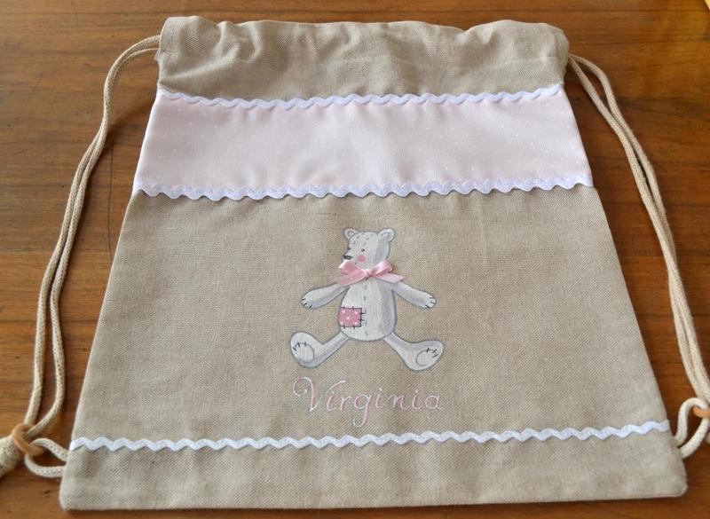 Al lavoro! L’immancabile base di tessuto beige è decorata con tessuto rosa a pois e dettagli bianchi. Abbozzo con la matita l’orsetto e nome.
