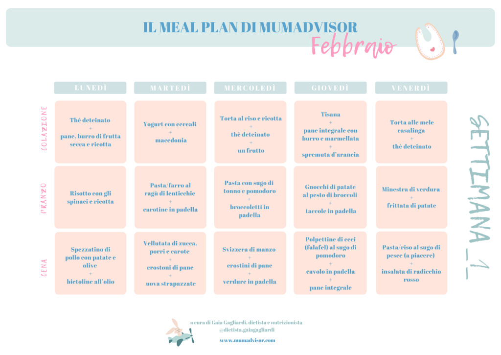 Eccoci di nuovo qui mums, con il nostro nuovo appuntamento di inizio mese: il meal plan da stampare, studiato per voi dalla nostra dietista e nutrizionista Gaia Gagliardi! Abbiamo deciso di lanciare questo nuovo progetto a inizio anno, un po’ come buon auspicio, ma soprattutto perché sappiamo bene che noi mamme siamo perennemente di corsa e avere un piccolo aiuto per pianificare meglio i pasti, variando anche l’alimentazione di tutta la famiglia, riducendo sempre più al minimo i “pasti salva cena” dell’ultimo minuto, può davvero fare la differenza!
