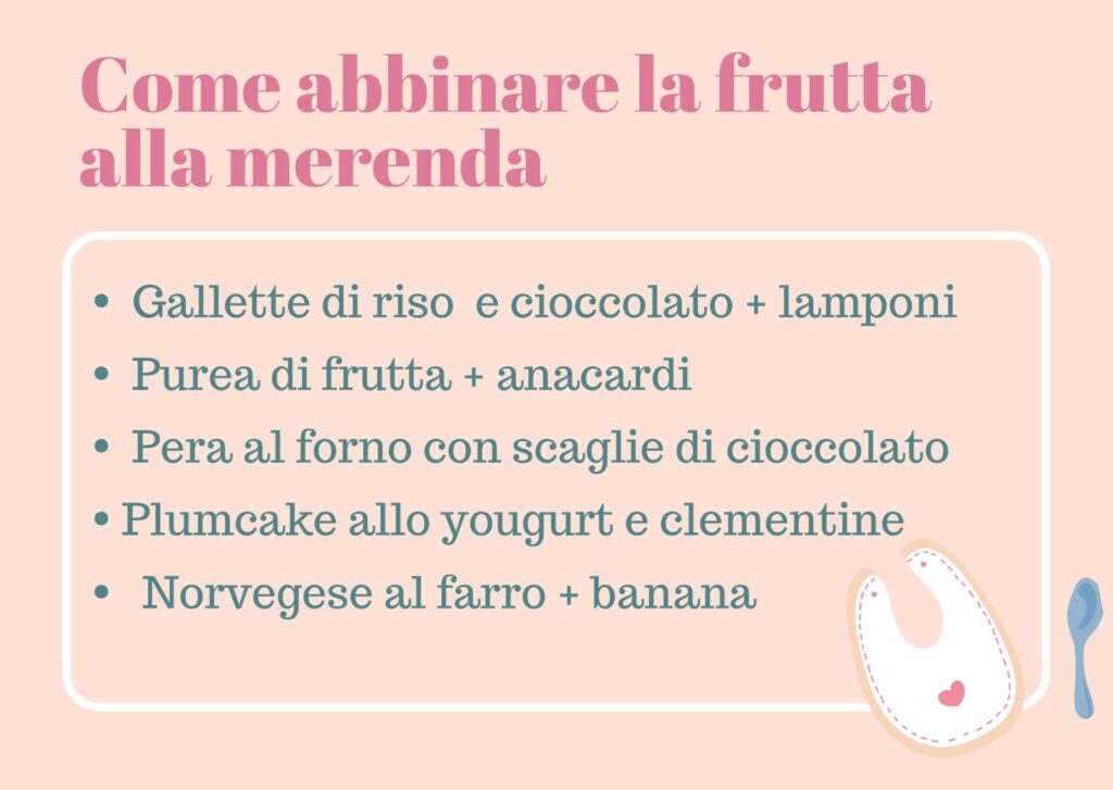 Non è necessario che la merenda sia sempre uguale, anzi, variare è utile sia per far conoscere nuovi gusti e alimenti al bambino, sia per non cadere nella monotonia. L’acqua è l’unica bevanda che non dovrebbe mai mancare ed essendo la merenda un piccolo pasto è bene preferire alimenti come frutta e/o verdura che hanno una buona capacità saziante, magari da abbinare ad altro come pane, crackers, grissini, frutta secca, cioccolato, biscotti secchi o torte semplici.