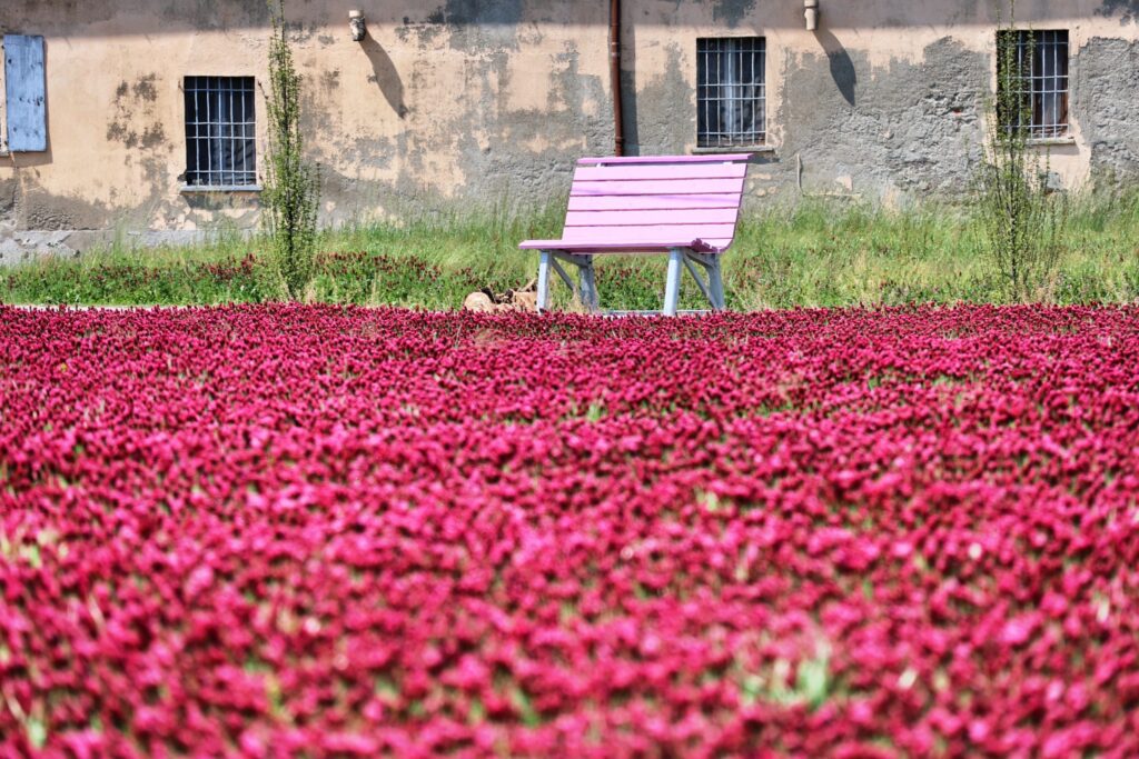 In questi giorni la natura attorno alla Cascina sta regalando uno spettacolo davvero incredibile: quello della fioritura del trifoglio rosso e per ammirarlo potete stare comodamente seduti su una bellissima panchina gigante, color lilla, , voluta proprio dai proprietari della cascina e accessibile a tutti. Una doppia occasione per andare a trovarli e – perché no – magari cogliere l’occasione anche per acquistare il riso milano di loro produzione.