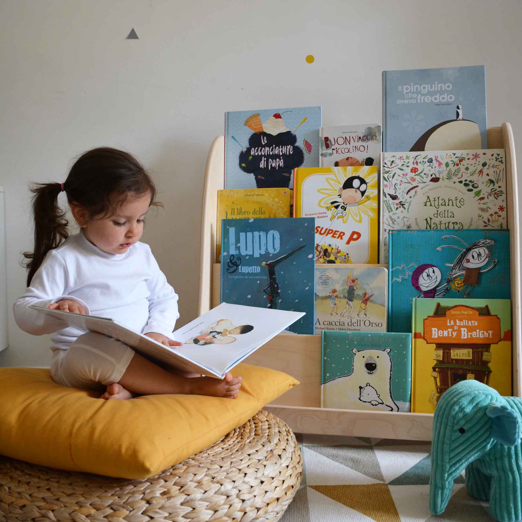 Per i bambini nei primi anni d’età è bene scegliere librerie con esposizione frontale, in modo che la copertina dei libri sia ben visibile e facilmente raggiungibile. Qualsiasi tipo di libreria per cui possiamo optare (a parete, autoportante, con rotelle, girevole etc….) è fondamentale che sia sempre accessibile dal bambino, in sicurezza.