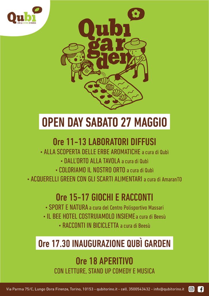 Sabato 27 Maggio vi aspetta un ricco calendario di proposte di laboratori e giochi per bambini. A seguire avverrà l’inaugurazione ufficiale di QuBì Garden e poi un aperitivo.
