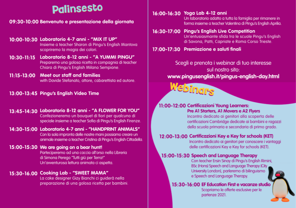Il 7 marzo non perdetevi il Pingu’s English Day: una giornata di laboratori gratuiti in inglese, dedicata ai bambini dai 4 ai 12 anni, per giocare, ridere e divertirsi in compagnia di insegnanti madrelingua e di Pingu!