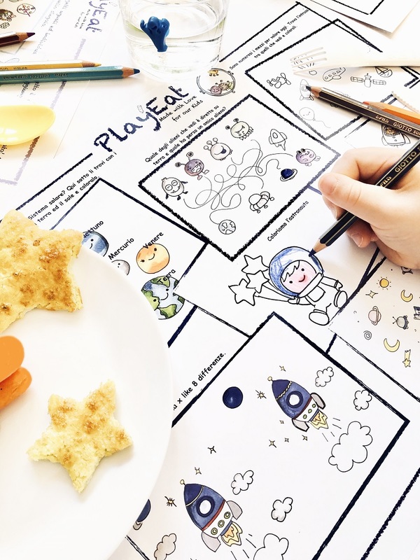 Un paio di alternative che vi suggerisco sono “L’era dei dinosauri” formata da foreste di cavoli e cavolfiore di svariati colori, frittata a forma di stelline e “Lo Space Shuttle” composto da carotine, oblò di lenticchie, stelline di frittata e tante altre idee che potrete mettere in pratica con i vostri bambini seguendo le tematiche delle tovagliette PlayEat!