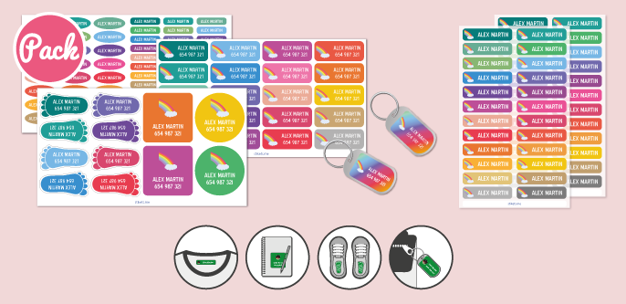 Oltre a questo nel pacchetto troverete le etichette per vestiti termoadesive che, col calore del ferro da stiro, si attaccheranno saldamente alla divisa, al grembiule o all’indumento che porteremo a scuola. E quest’anno saranno utili anche per personalizzare le mascherine, obbligatorie dai 6 anni, che più di ogni altra cosa non potranno essere “scambiate” con quelle dei compagni.