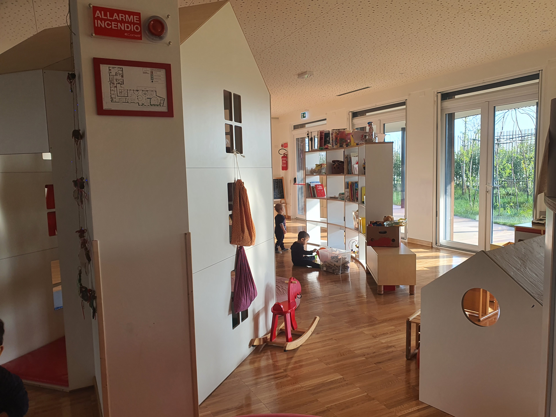 Di grande rilievo in questo servizio educativo è l’ambiente, un luogo di straordinaria bellezza, in cui la luce naturale e le ampie vetrate facilitano la comunicazione dei bambini con lo spazio verde circostante e dedicato al nido.