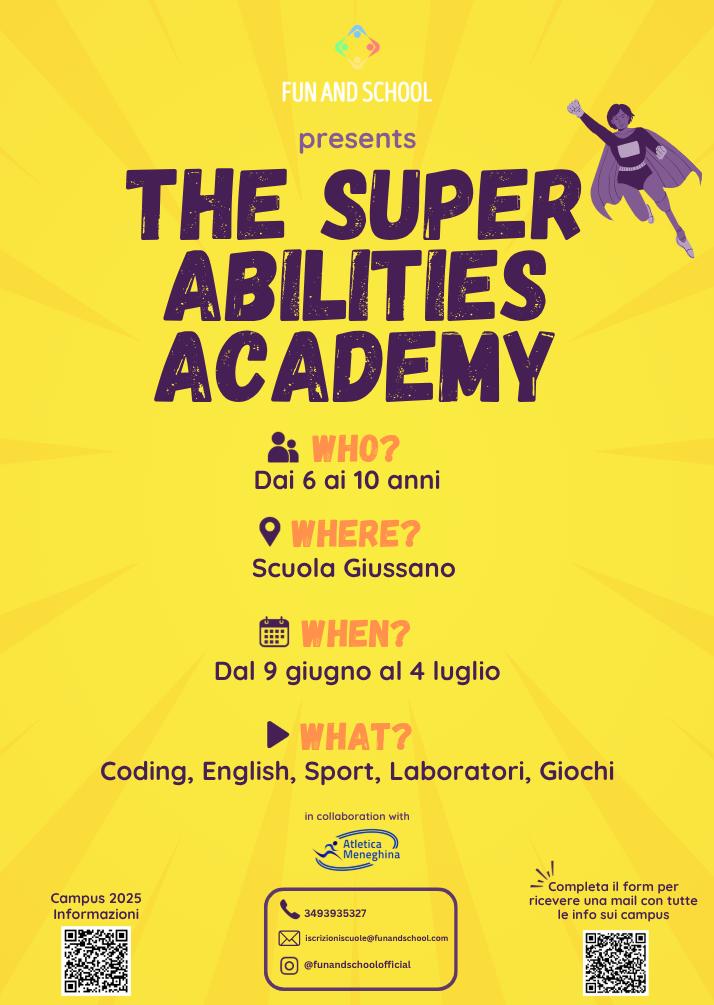 Mums siete pronte a conoscere “The Super Abilities Academy” di Fun and School! Siamo un team che crede nell’importanza di unire l’apprendimento al divertimento e alla crescita personale. Durante l’anno collaboriamo con tante scuole e coinvolgiamo un sacco di studenti con corsi di inglese, coding e altre attività. La nostra metodologia è pensata per far imparare in modo attivo e coinvolgente, stimolando la creatività, la curiosità e la collaborazione dei ragazzi.
