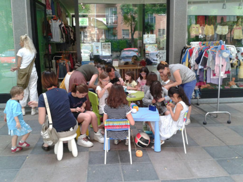 Lo spazio sotto i nostri portici, di fronte al negozio, ci permette di organizzare con la bella stagione laboratori creativi per i piccoli e comunque è ormai famoso il nostro tavolino dove, tutto l’anno (anche con il freddo!), chiunque può fermarsi a disegnare, pasticciare un libro o fare merenda.