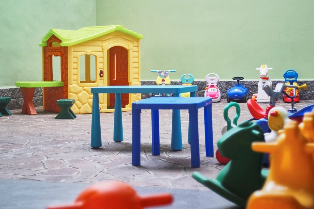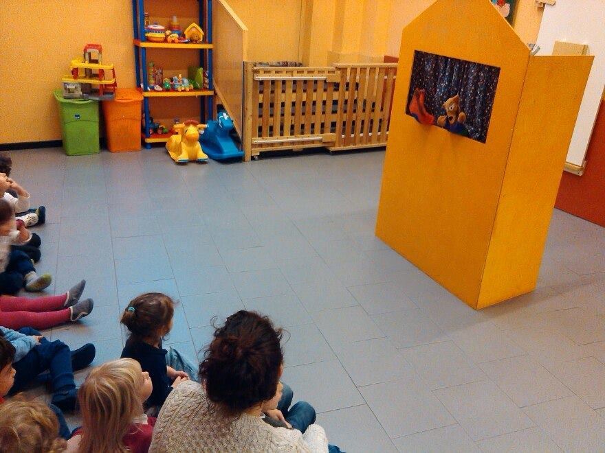 Il Nido è un open-space suddiviso in aule tramite pannelli sagomati a castello, ha poi un’area comune destinata a giochi di movimento, teatrino dei burattini e mensa.