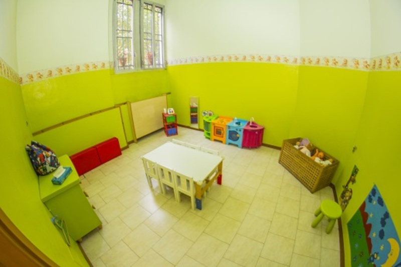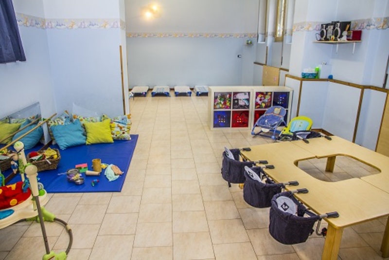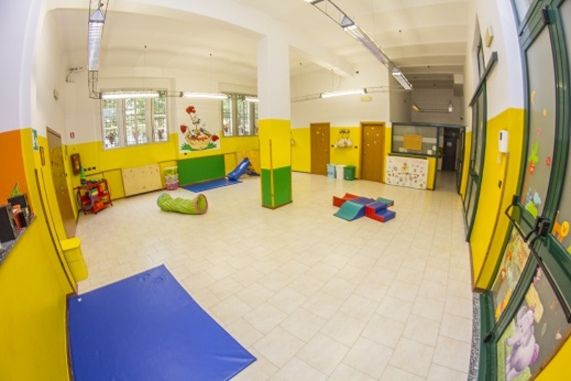 Lo spazio si apre con un grande salone dedicato prevalentemente alla psicomotricità e al gioco libero, proseguendo in due stanze tematiche, una dedicata al gioco simbolico e l’altra a misura di lattante con corner morbidi e giochi pensati per i più piccoli. Seguono una sala polifunzionale, attrezzata per il pranzo e i laboratori espressivi e manuali, un luminoso bagno destinato alla cura e all’igiene dai bambini, ed un giardino esterno per le attività estive.