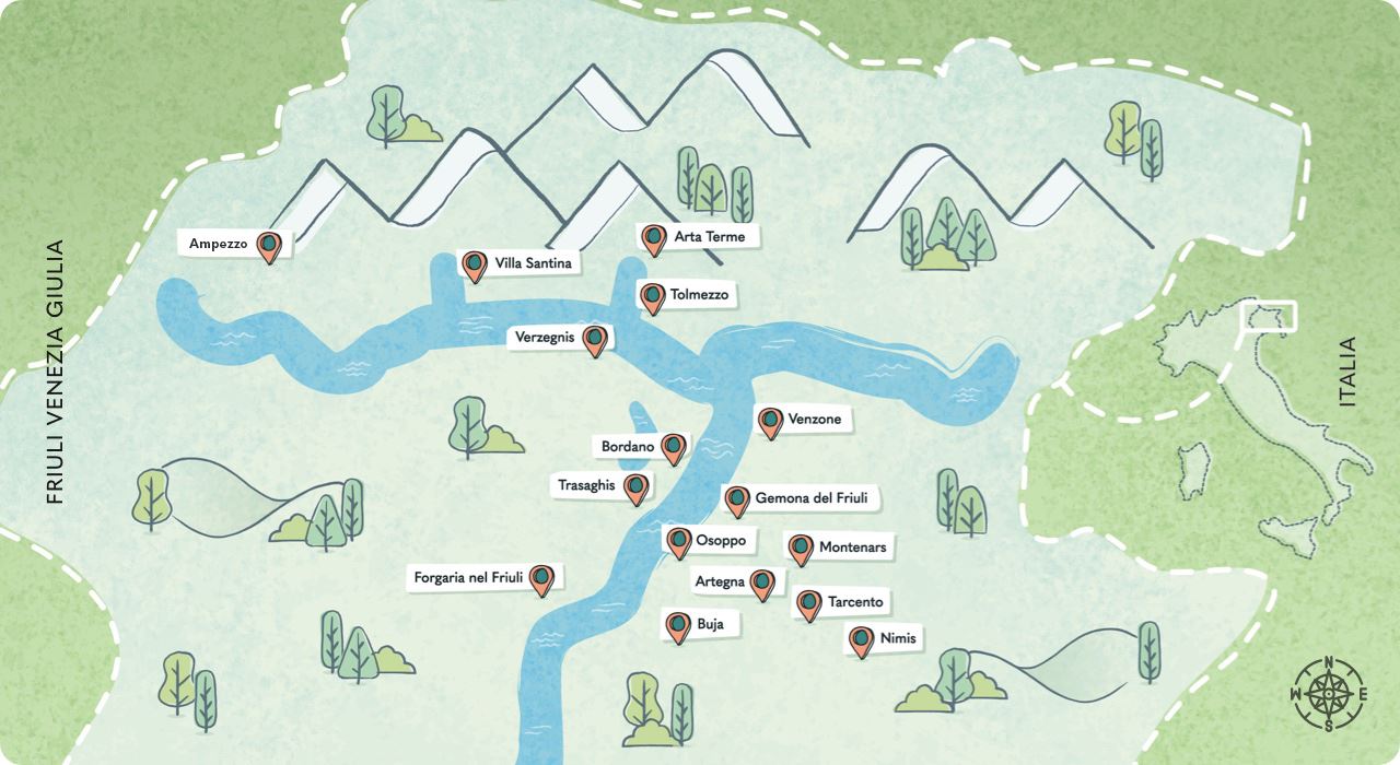 I comuni coinvolti sono Ampezzo; Arta Terme; Artegna; Bordano; Buja; Forgaria nel Friuli; Gemona del Friuli; Montenars; Nimis; Osoppo; Tarcento; Tolmezzo; Trasaghis; Venzone; Verzegnis; Villa Santina.