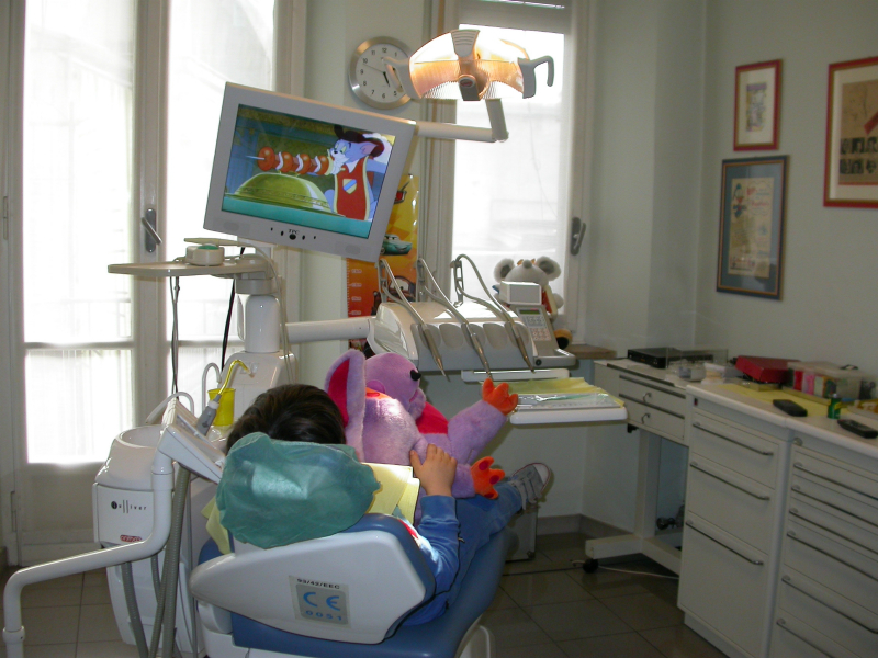 Per mettere i “piccoli pazienti” a proprio agio, anche la sala d’attesa ha una zona speciale, con giochi a tema e una bacheca per appendere i disegni. La poltrona assomiglia a un’astronave, dotata di schermo per guardare i cartoni animati, che spaziano da lezioni su come lavare bene i denti , a Topolino, a Tom&Jerry e Scooby Doo per l’intrattenimento durante la visita. Conclude la seduta un regalo, composto da un kit di spazzolino e dentifricio, accompagnato da un palloncino.