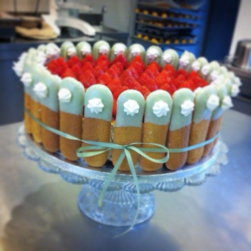 Uno strato di frolla, crema, pallini di cioccolato crunchy, pan di Spagna, frutti di bosco, coperta di panna circondata di meringhe e decorata come un cestino di frutta e fiori.