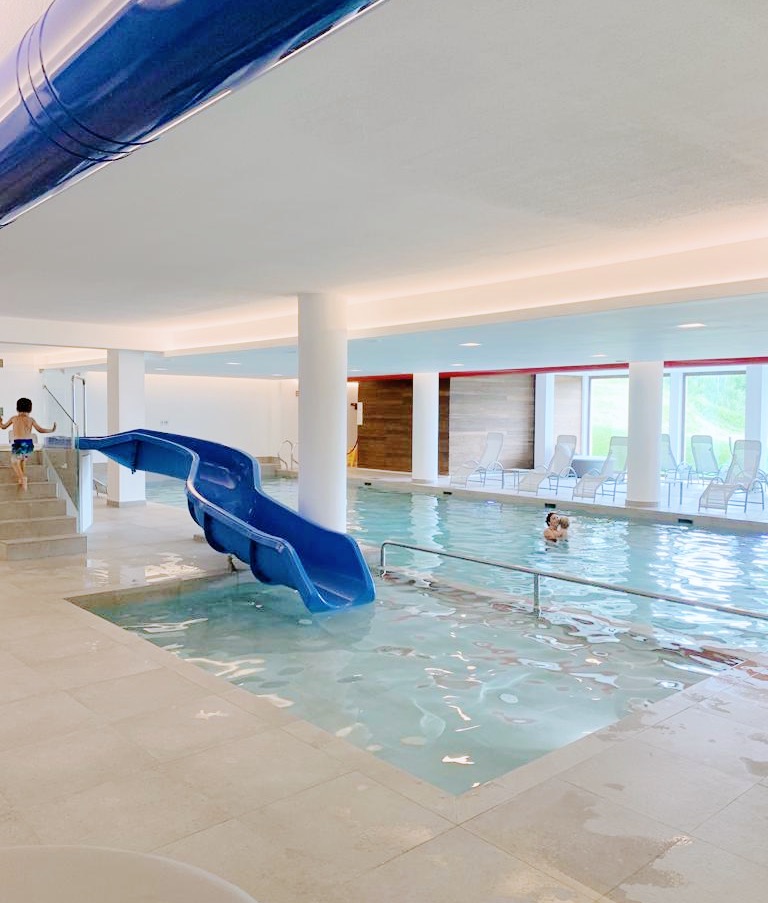 Seppur riparati dall’ombra degli alberi, comunque è stata una bella camminata di circa un tre ore e quindi, al nostro rientro in hotel, abbiamo deciso di rilassarci nella meravigliosa piscina panoramica super kids –friendly. Nella vasca più grande (1m20) ci si può fare delle belle nuotate, poi c’è ovviamente quella più bassa con lo scivolo per i bambini, una ancora più bassa dove il mio piccolino si è divertito a pucciare i piedi e poi anche un simpatico campo da mini-golf acquatico molto divertente. E per la mamma e il papà, ci sono dei comodissimi lettini posizionati proprio davanti alla grande vetrata che dà sulla vallata … è stato un pomeriggio davvero perfetto che si è concluso con una cena speciale per il mio compleanno! Cosa volere di più?