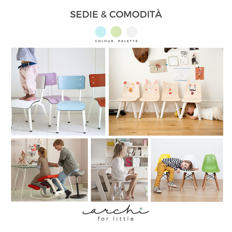 Per i più piccoli esistono le sedie in versioni ridotte di icone del design, riproduzioni di quelle scolastiche ma in versione più giocosa e allegra, altre che con la loro forma richiamano gli animali, sgabellini che hanno la possibilità di agganciare utili accessori come porta pastelli, e sedie multiuso che passano da sedia a oggetto cavalcabile.