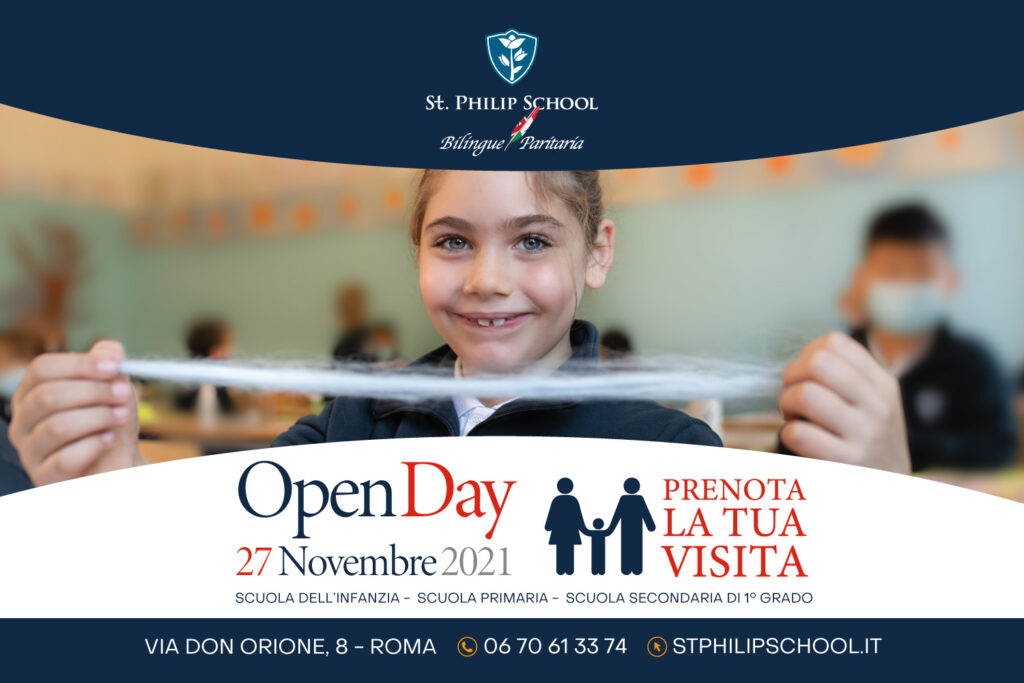 St Philip School vi aspetta sabato 27 novembre, dalle 10.00 alle 13.00, all’interno della sua struttura per presentare il curriculum e i progetti della Scuola del’Infanzia, della Scuola primaria e della Scuola Secondaria di Primo Grado.
