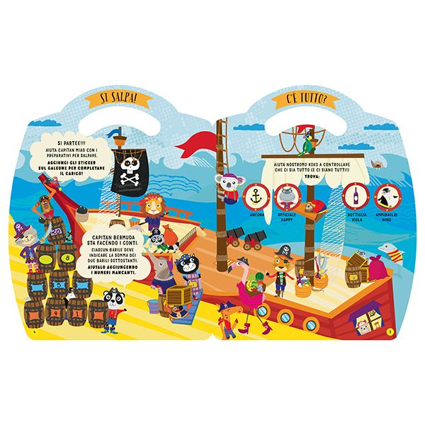 Questo è un pratico, coloratissimo libro a valigetta ricco di giochi e attività divertenti che i vostri bimbi possono portare sempre con sé grazie al particolare formato e alla pratica maniglia. Mentre noi chiacchieriamo e ci gustiamo il nostro aperitivo, i bimbi saranno impegnati a salpare verso l’isola del tesoro insieme a Capitan Leo e ritracciare la rotta giusta tra mappe e labirinti, dovranno scoprire le differenze tra i vari pirati, decorare il proprio galeone con tanti e coloratissimi stickers, trovare oggetti nascosti e tanto, tanto altro.