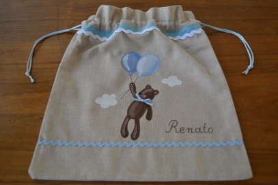 Disponibile per maschietto e femminuccia, il sacchetto di 30×30 cm circa contiene tutto il necessario gia pronto per il cambio o una poppata! Sul bordo superiore del sacchetto tessuto di cotone color lino viene cucita una fettuccia rosa o celeste e una serpentina bianca. Nella parte bassa una serpentina rosa o celeste. Si chiude con un laccetto di coda di topo.Poi la personalizzazione: dipingo a mano un soggetto (di solito un orsetto) e il nome del bambino con vernice lavabile. L'ultimo tocco è il fiocchetto cuscito sul l'orsetto. Ecco cosi uscendo con vostro bébé sarete sempre chic e organizzati!