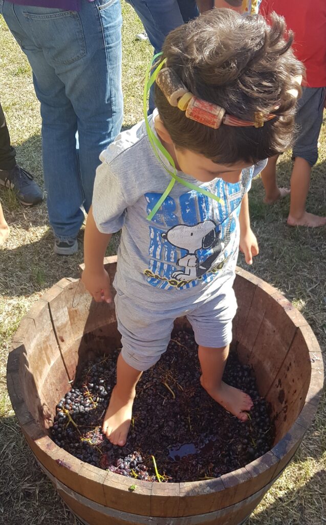 Tutto questo per tamponare l’attesa, perché ovviamente il pezzo forte di tutta la giornata era il momento della pigiatura dell’uva!!! Via scarpe, calzini (e per i più audaci pure i pantaloni) e tutti dentro le botti! E’ stato davvero divertente vedere le facce dei miei bambini che, all’inizio, sentendo la consistenza fredda e un po’ viscida dei chicchi d’uva sotto i piedi, quasi non volevano entrare … ma poi, una volta presa confidenza, e chi è più riuscita a toglierli di lì?